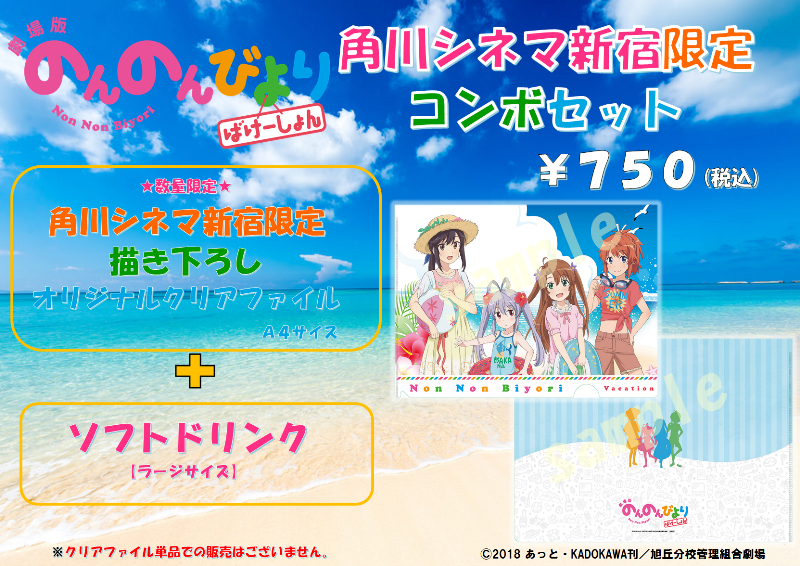 [商品概要] 販売価格:750円(税込) 商品内容:角川シネマ新宿限定 オリジナルクリアファイル(A4サイズ)+ソフトドリンク(Lサイズ) 販売場所:角川シネマ新宿 4F 売店 販売開始日:8月25日(土)オープン時から (当日角川シネマ新宿舞台挨拶回のチケットをお持ちの方のみ) 同日13:00頃(予定)よりどなた様でもご購入いただけます。 ※なくなり次第販売終了となります。 数量限定ですのでお早めにお買い求めくださいませ。 クリアファイル単品での販売はございません。 |