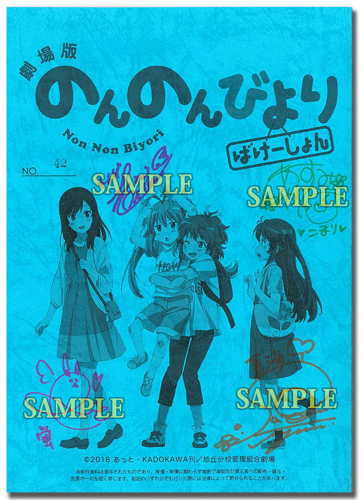 「劇場版 のんのんびより ばけーしょん」限定版 【Blu-ray】を下記の対象店舗にてご予約・ご購入頂いた方の中から抽選で、キャストの直筆サイン入り台本をプレゼント! 《対象商品》 劇場版 のんのんびより ばけーしょん 限定版【Blu-ray】 《アイテム》 キャスト直筆サイン入り台本 ◆宮内れんげ:小岩井ことり 《対象店舗》 ◆アニメイト全店(オンラインショップ含む) ◆ゲーマーズ全店(京都店を除く) ◆ゲーマーズオンラインショップ ◆とらのあな全店(一部店舗を除く、通信販売を含む) ◆ソフマップ.com