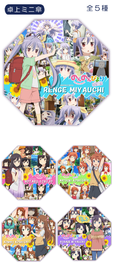 アニメ本編での各キャラのいいシーンを抽出し、フォトアルバム風にデザインさせて頂きました。お好みのキャラをフルに堪能できる仕様になっております。傘表面もフラットで石突もなく絵柄を全面に見せられる観賞用仕様となっております。小さくコンパクトな仕様なので使用用途は多様、思い思いの場所に飾って頂けます。宮内れんげ・一条蛍・越谷小鞠・越谷夏海・宮内ひかげの5種をラインナップ。