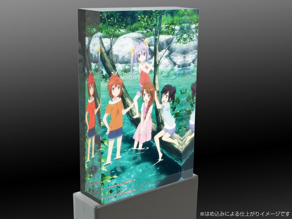 小川で遊んでいる4人を、アクリルならではの美しい色合いと透明感で楽しめるアイテムが登場!クリアアートキューブとは、厚みのあるアクリル素材を使用し、透き通る透明感と、イラストの美しさを楽しめるインテリアアイテムです。 見る角度により、側面、底面などにイラストが反射するため、どこからでもご鑑賞いただけます。 通常のプリントグッズのように下地を印刷しておりませんので、飾る場所によっても表情を変えるアイテムとなっております。
