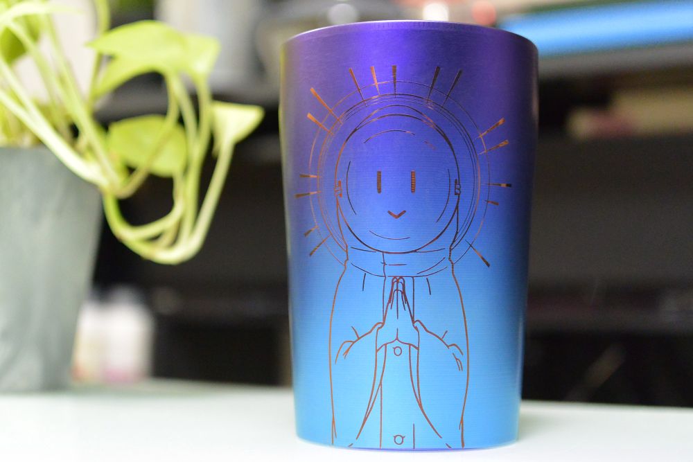 「宮内れんげ」が自転車の練習のためにてるてるぼうずを作ったシーンを忠実に再現しました!表面は雨に濡れる前のれんちょんを、裏面には雨に濡れた後のれんちょんをそれぞれデザインしております。裏側の図柄は受注ページにてご覧ください。インクや着色料を一切使用せず、チタンの酸化膜により発色しているチタン製タンブラーはかなり珍しい逸品です!是非この大変貴重なアイテムを手に入れて下さい!!