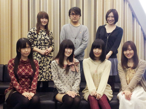 ▶左前から、小岩井ことり(宮内れんげ役)、村川梨衣(一条蛍役)、佐倉綾音(越谷夏海役)、阿澄佳奈(越谷小鞠役)、左後から、佐藤利奈(加賀山楓役)、川面真也監督、名塚佳織(宮内一穂役)